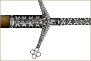 両手持ちの大剣 15精機から17世紀にかけてスコットランドで使われた剣です。 クレイモアと呼ばれる剣はもうひとつあって、篭柄の片手剣なのですが、 この絵は大剣の方です。
