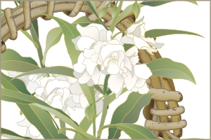 唐から渡来し霊を招くという意味で付いた名前らしいです。 この花が招霊(オキタマ)とどういう関係があるのかはわかりませんでした。